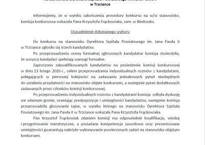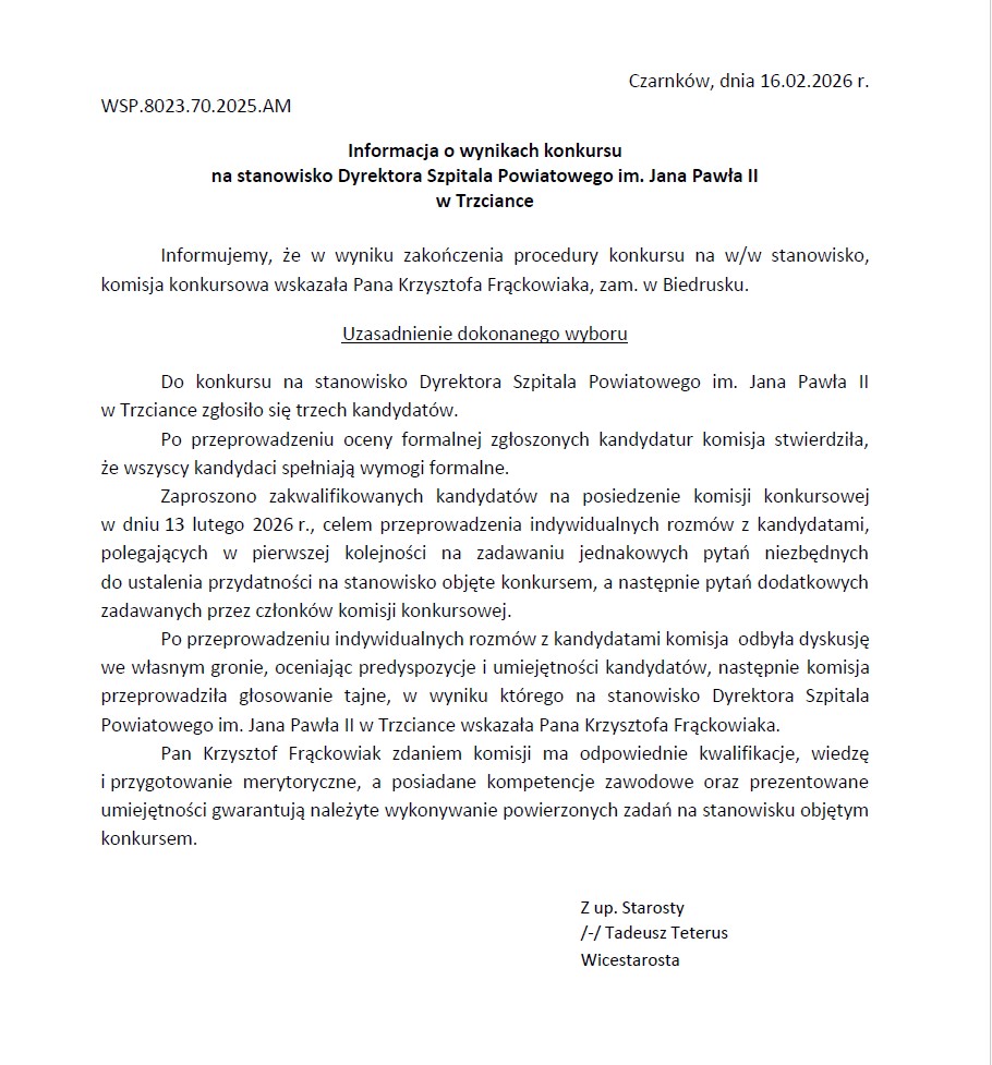 Informacja o wynikach konkursu na Dyrektora Szpitala utworzone przez Sławomir Kuśnierek | lut 16, 2026 | Uncategorized Informacja o wynikach konkursu na Dyrektora Szpitala