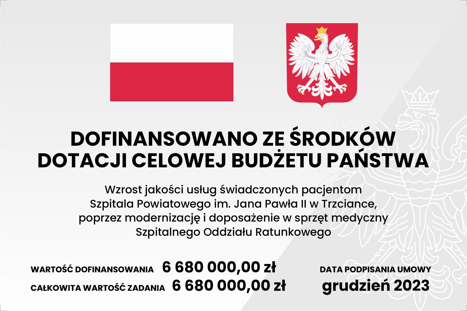 Szpital Powiatowy im. Jana Pawła II w Trzciance informuje, że 19 grudnia 2023 r. podpisał ze Skarbem Państwa – Ministrem Zdrowia umowę na dotację celową pn.: