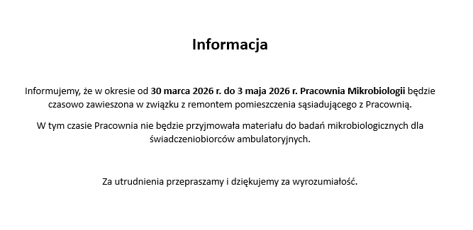 Szanowni Państwo! uprzejmie informujemy, że w dniu 14 maja 2021 r. Administracja, Biuro Przyjęć, Laboratorium, Mikrobiologia oraz Zakład Diagnostyki Obrazowej Szpitala Powiatowego im. Jana Pawła II w Trzciance będzie nieczynne. Za wszelkie niedogodności serdecznie...